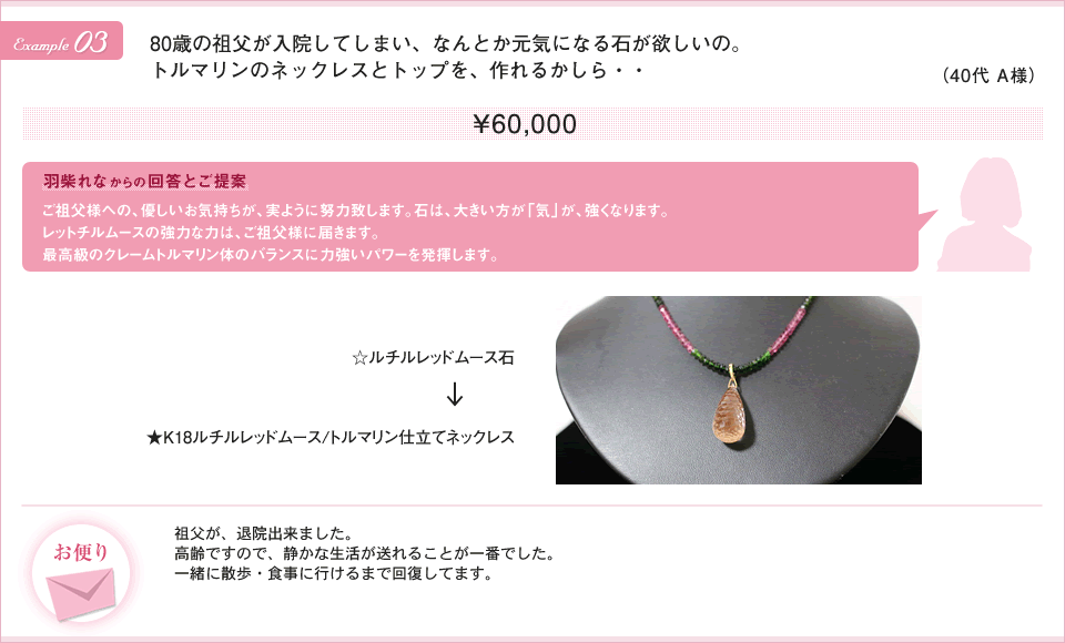 ストーンリフォームとはお持ちのパワーストーンをリメイクしたり、 リフレッシュさせるサービスです。 また、思い入れのあるストーンを現代に合わせてリフォームします。 思い入れの強いストーンはリフォーム後大きな力を発する場合が多く、 この事からも甦る事でストーン達が喜んでいるのがわかります。
